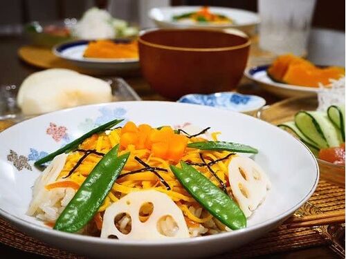 晩ご飯ブログランキング 彩りが楽しいちらしずし。 炊きたてのごはんに甘酢を混ぜて 甘辛く煮たごぼう、にんじん、油揚げ、しらす干しなどを混ぜ込みます。 そして、錦糸卵、れんこんの甘酢漬け、きぬさや、刻みのりを添えると 「おいしそ~う」の声^^ 冷…