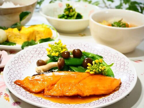 ランキングに参加してます。応援お願いします♪ 日中の雨もやんで、ちょっと霞んだ春らしい夕暮れどき。 和食の定番、照り焼き。 今日は使い勝手のいい、鮭の切り身で作りました。 小麦粉をまぶして両面を焼いたら、酒を注ぎ入れて蒸し焼きに。 ふっくらと蒸…