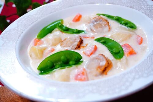 ランキングに参加してます。クリックしていただけると嬉しいです(*^_^*) 主菜は今まさに旬を迎えたマダラのソテー。 バターとみそで風味とコクをプラスした、きのこソースをかけていただきます。 クリームシチューには、ほたて、新じゃがいも、玉ねぎ、にん…