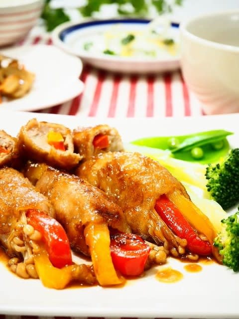 豚ロース薄切り肉にえのき、パプリカをのせてクルクルっと巻いて。