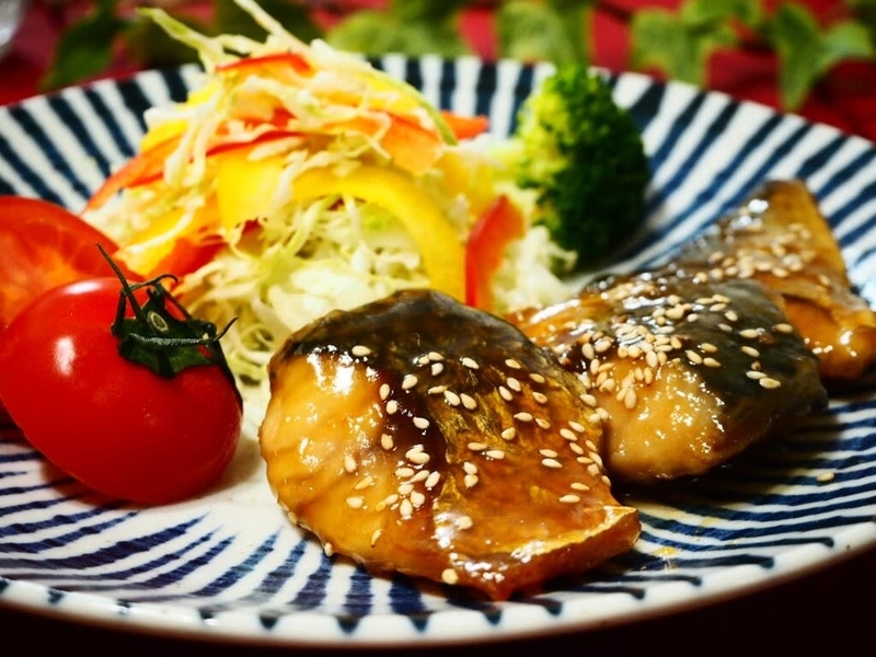 片栗粉をまぶして焼いたさばに甘辛いたれをからめると、まったり&しっとり。