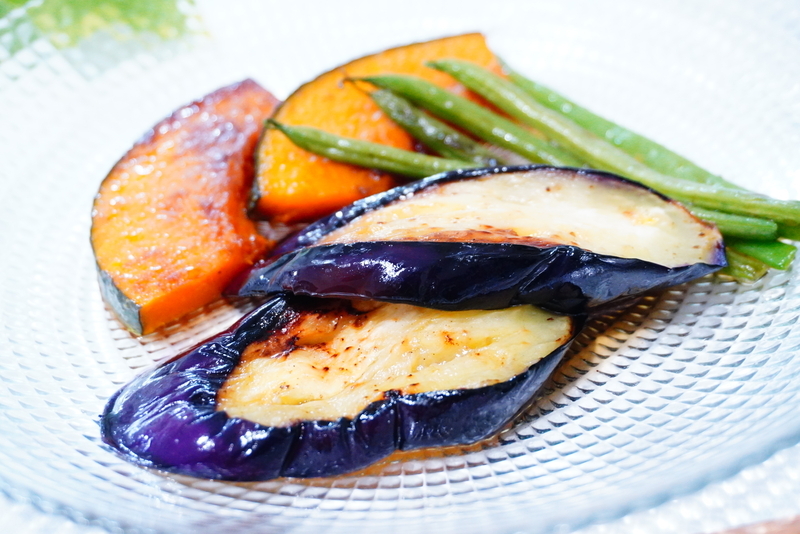 なす、いんげん、かぼちゃ(適宜に切り、ラップをかけてレンジで加熱してから焼きました)をオリーブオイルでこんがり焼き、めんつゆ(適量)+熱湯or水(適量)にしばらく浸します。